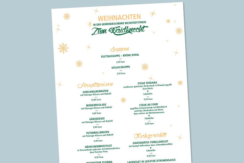 Weihnachtsmenü-Karte für die Gemeindeschänke in Bechstedtstraß "Zum Waidknecht"